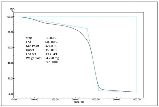 The TGA profiles of avocado-seed-starch-based and PLA degradable plastics are shown in Figure 6, respectively. There are weight losses in degradable plastic. The weight loss of the sample starts slowly at 30 °C. At this temperature, weight loss is caused by contaminants and other additives in the degradable plastic. The extreme weight loss starts at 356.86 °C to 413.64 °C, and crystallization occurs. In this state, most of the material decomposes and is completely depleted at 600 °C. In this study, the degradable plastic samples suffered a high level of thermal degradation. At this stage, the loss of hydrogen groups and the decomposition, depolymerization, and cracking of carbon chains in the starch structure occurred [,]. The total weight loss for avocado-seed-starch-based degradable plastic with PLA addition was 97.500% with 4.290 mg remaining. The thermogram change of TGA occurs due to the heat transfer of the degradable plastic and the reaction of the structure change and phase change of the degradable plastic. The significant weight loss in the range of 250–300 °C is due to the decomposition of gelatin and starch. From this, one could conclude that the prepared sample can be used in applications operating at high temperature levels [].