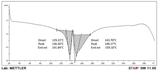 The DSC technique allows for the determination of a polymer’s melting point, the temperature at which the crystalline phase begins to form, the temperature at which the mesomorphic transition occurs, the changes in enthalpy and entropy, the glass transition temperature, and other effects that feature either change in heat capacity or latent heat. The DSC test was conducted using starch (1.8 g; PLA 3 g) as the test component in the degradable plastic. The DSC curve can be seen in Table 12 and Figure 7.