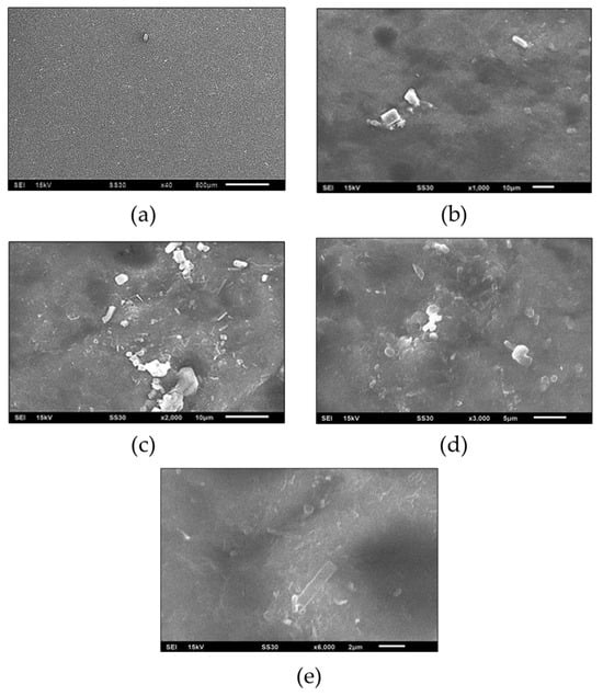The SEM analysis results demonstrate the morphology of the particles embedded within the matrix. It is thereby revealed whether the distribution of the particles within the matrix is homogeneous or heterogeneous. The SEM magnification of 40×, 1000×, 2000×, 3000×, and 6000× was used to analyze both avocado-seed-starch- and PLA-based degradable plastics, as demonstrated in Figure 9. It can be observed that the morphological results are more clearly visible at the 2000× magnification. The presence of white lumps and indentations on the surface of degradable plastics is evident in Figure 7. The results show that the plastic’s avocado seed starch PLA and other additives have not fully dissolved, so the shape is uneven. The main factor is stirring because it affects how well the starch PLA and additives dissolve. The surface features are comprised of granules (the residual portion of the starch particle), indicative of the incomplete gelatinization of the starch during its formation [].