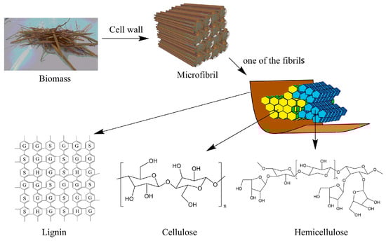 Of the three main components of lignocellulosic biomass, cellulose and hemicellulose are two major carbohydrates that are tightly bound to lignin, forming a complex and stubborn structure (Figure 1) [15]. Cellulose is the main component of lignocellulose and is composed of glucose molecules linked by β-(1–4)-glycosidic bonds [18]. The polysaccharides in the biomass are linked to each other by hydrogen bonds, which help cellulose to crystallize and resist degradation, thus making subsequent separation processes difficult. Cellulose can be hydrolyzed into glucose by enzymatic hydrolysis, which can be further converted into high-value compounds. Hemicellulose is the second most abundant component in lignocellulose. Hemicellulose is linked to cellulose by hydrogen bonds and van der Waals interactions, which enable hemicellulose to form a highly resistant network with cellulose [19]. Unlike cellulose, hemicellulose consists of short, highly branched polymers of five- and six-carbon polysaccharide units, such as xylan, mannan, β-glucan, and xyloglucan. The highly branched and amorphous nature of hemicellulose makes it easy to convert. Compared with cellulose and lignin, hemicellulose has a much lower degree of polymerization, making it less stable than cellulose [20].