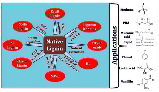 Different lignin extraction or separation processes and common applications of lignin [14].