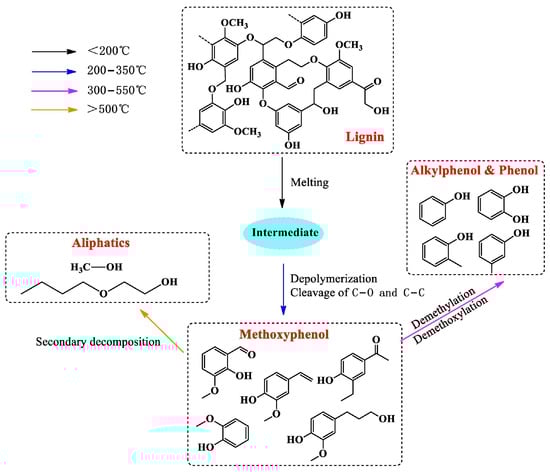 As the temperature rises, different chemical bonds in the lignin structure can be broken one after another, so multiple reactions will occur during the entire lignin thermal depolymerization process, which makes it difficult to clearly classify the pyrolysis stage. To simplify the understanding, most pyrolysis processes are divided into two stages according to differences in the lignin depolymerization products [38]. The main pyrolysis process of lignin occurs in these two stages. When the pyrolysis reaction temperature is in the range of 150–400 °C, it belongs to the first stage of pyrolysis. In this process, due to the relatively high stability of aromatic methylation groups and condensation bonds, the depolymerized lignin fragments produced in this stage are mostly basic units of lignin, such as 4-methylguaiacol, eugenol, and coniferyl alcohol, as well as some chemicals derived from lignin, such as vanillin, isoeugenol, and certain unsaturated alkyl groups. It is particularly worth mentioning that vanillin is converted from lignin and has shown great potential for commercialization. In the second stage of pyrolysis, most of the ether bonds will be broken, including β-O-4 bonds, which are the most abundant bonds in lignin and account for more than 60% of the total bonds in hardwood lignin. The breaking of β-O-4 bonds is crucial to improving the quality of lignin depolymerization products.
