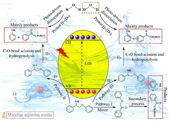 Overall, different photocatalysts have their unique advantages and disadvantages. To overcome these inherent limitations and further enhance their advantages, various photocatalysts can be coupled to form heterojunction materials. This new type of heterojunction photocatalyst usually exhibits more significant advantages than a single photocatalyst, such as an extended carrier lifetime, improved solar energy absorption, more efficient separation and transport of electron–hole pairs, and controlled chemical potentials that are more suitable for the desired chemical reaction. At the same time, an environment conducive to the photocatalyst to exert its maximum catalytic performance can be created to achieve the maximum catalytic effect. For example, Xu et al. [84] used water as a hydrogen source to provide hydrogen in the process of the photocatalytic cleavage of C–O bonds, and successfully synthesized a micellar water medium composed of hexadecyltrimethylammonium bromide (CTAB) and water, which can effectively disperse lignin and provide hydrogen for the photocatalytic reaction (Figure 6). At the same time, the photocatalyst CdS was used to efficiently break the C–O bonds of lignin, and a high photocatalytic efficiency was obtained. Under optimal conditions, the photocatalyst CdS successfully depolymerized lignin to obtain ketones and phenolic compounds. Water can provide hydrogen for the photocatalytic cleavage of lignin C single bonds and O bonds, and a large amount of hydrogen plays a key role in improving photocatalytic efficiency. The proper inhibition of water on photogenerated holes can also effectively promote the cleavage of lignin C–O bonds. This study provides a new idea for the photocatalytic cleavage of lignin C–O bonds and promotes the high-value utilization of lignin. Dai et al. [85] synthesized a CdS/BiOI-VI photocatalytic heterojunction containing iodine vacancies (VI) by the solvothermal method, and achieved an efficient conversion of sodium lignin sulfonate to vanillin under visible light irradiation. The experimental results show that the use of the CdS/BiOI-VI heterojunction can obtain a higher vanillin yield. In addition, Cui et al. [86] also prepared a Z-type multi-component CdS/HPA-2/CN heterojunction photocatalyst by the hydrothermal method, and conducted in-depth research on its performance in the depolymerization of lignin into aromatic monomers. Their results showed that after 4 h of photocatalytic depolymerization, the total yield of vanillin and vanillic acid could reach 3.27%. More importantly, the authors also proved that after three consecutive cycles of use, the yield of aromatic monomers of this heterojunction catalyst could still remain at 81.0% of the initial value, showing good stability and reusability.