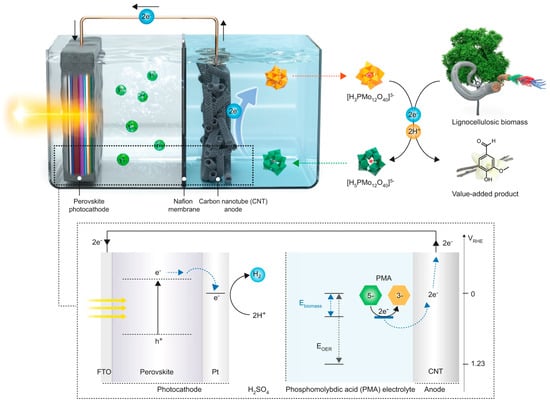 Similar to photocatalysis, electrocatalytic strategies have also attracted much attention for their high efficiency and environmental protectiveness. Combining photocatalysis with electrocatalysis can not only effectively suppress the recombination rate of photogenerated electron–hole pairs on the surface of photocatalysts, improving catalytic efficiency, but also promote the electrochemical oxidation process, thereby accelerating the depolymerization of lignin. Choi et al. [87] developed a biomass-assisted solar hydrogen production system (Figure 7). The authors used halide perovskites as photocathodes and wood cellulosic biomass (LC) as a low-potential electron source to produce hydrogen. At the same time, they also introduced phosphomolybdic acid (PMA) as a soluble catalyst to more effectively extract electrons from biomass. Under simulated solar illumination conditions, PMA showed the ability to selectively depolymerize lignin in wood cellulosic biomass, producing value-added chemicals such as vanillin and acetyl vanillone. What is even more gratifying is that in this process, the structure of the cellulose and hemicellulose remains intact, which provides the possibility for further utilization in the future.