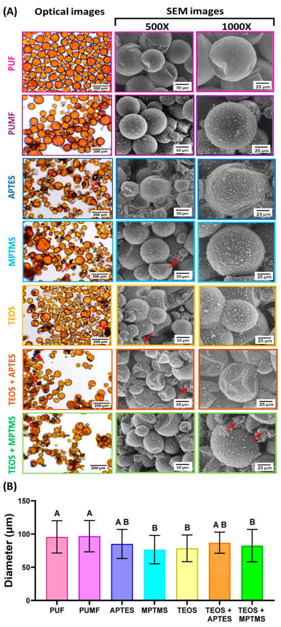 (A) Optical and scanning electron micrographs of unfunctionalized (PUF and PUMF) and PUMF-functionalized microcapsules. Optical micrographs were taken after dispersing the microcapsules in distilled water at 10× magnification. For SEM imaging, the microcapsules were dispersed on a silicon wafer plate, sputter-coated with gold, and imaged in low vacuum mode at 10 kV with an average working distance of 20 mm and magnifications of 500× and 2000×. Red arrows indicate the formation of aggregates of both silane and melamine–formaldehyde nanoparticles. (B) Average diameter (µm) of the microcapsules for all synthesized groups. The diameters were calculated by analyzing the optical micrographs using ImageJ, measuring, and averaging the diameter of 50 microcapsules for each group. Data from all groups were analyzed by one-way ANOVA and Tukey’s test; different letters indicate statistically significant differences (p < 0.05).