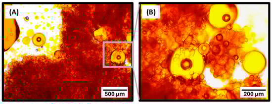 Optical micrographs of PUF microcapsules at 4× (A) and 10× (B) magnifications after treatment with the APTES functionalizing agent. Pronounced leakage of the healing agent (tagged in orange) is observed, attributed to the fragility of the microcapsule shells, which did not withstand the additional stirring and solvent exposure required for the surface functionalization procedures.