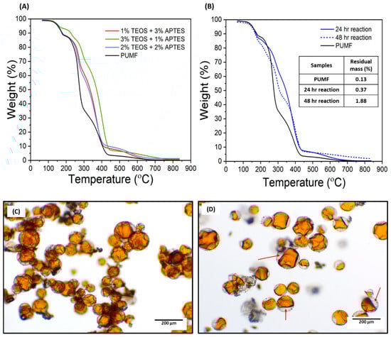 Thermogravimetric curves of functionalized microcapsules. Each sample was equilibrated at 50 °C, then heated to 65 °C and held for 10 min. Samples were subsequently heated to 850 °C at a ramp rate of 20 °C/min. (A) Thermogravimetric curves of microcapsules functionalized with TEOS and APTES at different ratios in a one-step process totaling 4 wt% to prevent compound precipitation. For all compared groups, capsules were functionalized in a single solution containing both TEOS and APTES. Testing with 4% TEOS and 4% APTES as a single solution preparation led to significant silane precipitation. (B) Comparison of microcapsules functionalized with TEOS and APTES in a two-step process with reaction times of 24 h and 48 h. “Two-step” groups were first functionalized with TEOS, then decanted, and subsequently functionalized with APTES. (C,D) Optical micrographs of PUMF microcapsules functionalized with TEOS and APTES in a two-step process: 12 h for each step (total 24 h reaction) (C) and 24 h for each step (total 48 h reaction) (D). In the 48 h reaction, a significant loss of the healing agent is observed, with the microcapsules being only partially filled, as indicated by the red arrows.