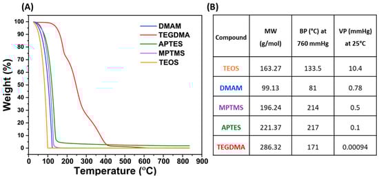 (A) Representative thermogravimetric curves of all the individual components of the microcapsules and functionalizing agents. (B) Table containing molecular weight (MW, g/mol), boiling point at 760 mmHg (BP, °C), and vapor pressure at room temperature (VP, mmHg) for all the starting materials. In general, the thermograms closely followed the vapor pressure of the materials. Specifically, the components with higher vapor pressure resulted in greater mass loss at lower temperatures.
