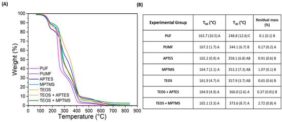 The efficiency of the functionalization procedures introduced in this study was carefully validated using TGA and XPS analyses. In the case of microcapsules, which, unlike glass filler particles, are completely degraded during the test, this analysis is more complex and serves better as a qualitative rather than a quantitative method. The thermal decomposition profiles of each group were analyzed in triplicate to assess the changes in thermal properties induced by each functionalization, and the resulting average curves are depicted in Figure 5A. Temperatures at which capsules lost 10% of their mass (T90) and 70% of their mass (T30) were selected as reference values for discussion of their thermal decomposition. The first noticeable difference is that all PUMF microcapsules exhibited a right shift in their thermogram curves compared to PUF and loss of 70% of their mass occurring at much higher temperatures (344.13 °C vs. 248.84 °C for PUMF and PUF, respectively) (Figure 5B). The increased thermal resistance observed in melamine-modified capsules was anticipated due to the higher crosslinking density facilitated by the triazine ring in the chemical structure of the melamine molecule [30,31]. Additionally, all the reinforcement/functionalization protocols resulted in a rightward shift of the thermograms compared to the non-functionalized PUMF control. This immediate effect strongly suggests that the synthetic protocols developed in this study effectively modified the surfaces of the microcapsules, thereby altering their chemical and physical properties. TEOS-modified microcapsules exhibited loss of 10% of their mass at the lowest temperature (T90 = 161.94 °C), which is likely related to the high vapor pressure of TEOS. However, when TEOS is combined with APTES or MPTMS, there is no significant difference in T90 compared to microcapsules functionalized solely with APTES or MPTMS (T90 for APTES = 165.18 °C, MPTMS = 164.66 °C, TEOS/APTES = 164.93 °C, and TEOS/MPTMS = 165.07 °C).