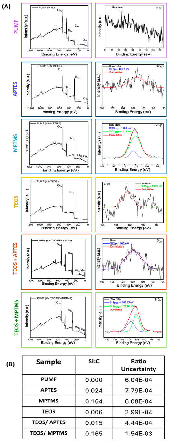 X-ray photoelectron spectroscopy (XPS) of PUMF-untreated and -functionalized microcapsules. To mitigate charge buildup during photoemission, the microcapsules were gently pressed onto indium foil. Measurements were performed using monochromated Al Kα radiation (1486.6 eV), with survey spectra acquired at pass energy of 100 eV and fine-scan spectra at 35 eV. (A) Survey spectra of PUMF control and functionalized microcapsules in the energy range from 0 to 1220 eV, and high-resolution spectra of the Si 2p region, from 100 to 96 eV. (B) Normalized silicon/carbon ratios (Si:C) derived from integrated areas under C 1s and Si 2p peaks, as well as the degree of uncertainty of the acquired results, for all tested groups.