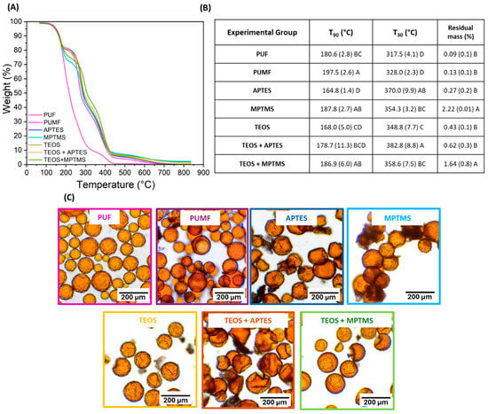 This similarity can be attributed to the two-step synthetic protocol, where microcapsules are first coated with TEOS followed by APTES or MPTMS. Therefore, the thermal decomposition behavior of the external layers in both single- and double-functionalized microcapsules, which are initially exposed to heat, is similar. In all functionalized microcapsules, the second mass loss event (T30) occurred at higher temperatures than the PUMF non-functionalized control, ranging from an increase of 9.04 °C (for MPTMS) to 29.46 °C (for TEOS/MPTMS). Notably, TEOS/APTES microcapsules retained 68% of their mass up to 300 °C. This enhancement in thermal resistance is likely due to the effects provided by the silane coupling agent molecules: (1) increase in crosslinking density and (2) formation of Si-O bonds [39,40]. The increase in crosslinking density alone makes the material more resistant to thermal degradation, as the reduced mobility of the polymeric chains poses a challenge for thermal energy to cause chain scission [38]. Si-O bonds, being more resistant to thermal cleavage than most organic bonds, further contribute to this stability [41,42]. Furthermore, the functionalized groups showed residual mass from 0.37% to 2.72% for TEOS/APTES and TEOS/MPTMS groups, respectively. This residual mass, resistant to temperatures as high as 850 °C, may be attributed to the formation of high-molecular-weight polysiloxanes [42]. These results collectively demonstrate that the tested protocols successfully modified the surface of the microcapsules.