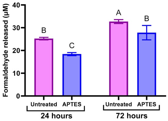 Average formaldehyde release (in µM) quantified by Purpald colorimetric assay for both untreated PUMF and APTES-functionalized microcapsules incubated in distilled water for 24 h and 72 h. Briefly, 100 mg of microcapsules were suspended in 5 mL of 1X PBS and then placed in 12–16 kDa molecular weight cut-off (MWCO) dialysis tubing, which was sealed. The dialysis tubing was immersed in 100 mL of 1X PBS and placed on a shaker operating at 60 RPM [29]. The samples were incubated at 37 °C, and aliquots of the outer PBS solution were collected at 24 and 72 h. Separately, a 34 mM Purpald solution in 2 M NaOH and a 2 mM sodium periodate solution in 0.2 M NaOH were prepared. For the assay, 0.5 mL of each PBS aliquot was mixed with 0.5 mL of Purpald solution and incubated at room temperature for 20 min. After incubation, 0.5 mL of sodium periodate solution was added to develop and stabilize the color [29]. Measures of 200 µL of each developed solution was transferred to a 96-well plate, and absorbance at 560 nm was measured using a plate reader. Formaldehyde concentrations were determined using linear regression from a calibration curve with formaldehyde concentrations of 50, 5, 0.5, and 0.05 µM. Data were analyzed using two-way ANOVA followed by Tukey’s test, with different letters indicating statistically significant differences (p < 0.05). The results demonstrated that surface modification with APTES significantly reduced overall formaldehyde emission, confirming its effectiveness as a formaldehyde scavenger.