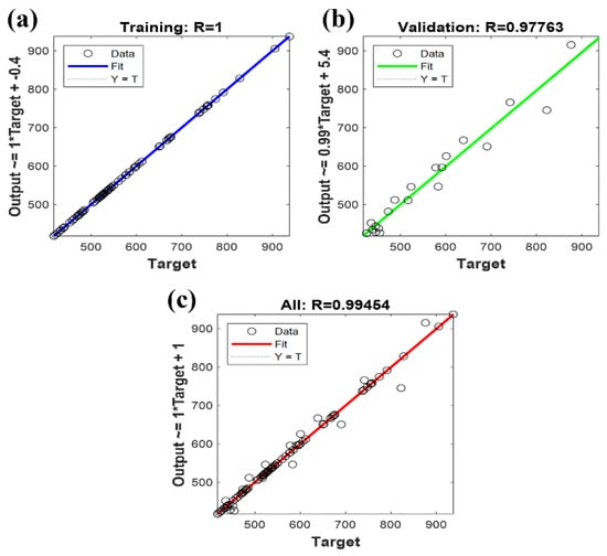 Predicted versus true values of artificial neural networks. (a) Training set R–value (b) Validation set R–value (c) Overall R–value.