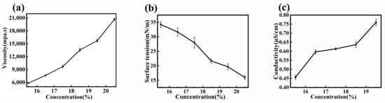 The conductivity of the spinning solutions with mass fractions of 15.5 wt%, 16.5 wt%, 17.5 wt%, 18.5 wt%, 19.5 wt%, and 20.5 wt% was measured using a DDS-307A conductivity meter (Shanghai Jiesheng Scientific Instrument Co., Ltd., Shanghai, China). Each solution was measured three times, and the average value was taken. The operating conditions were a temperature of 20 °C and 15% humidity.