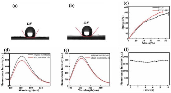 (a) Pure water contact angle of pure PVDF nanofiber membrane; (b) Pure water contact angle of TPE-doped PVDF nanofiber membrane. (c) Tensile stress-strain curves of pure PVDF membranes and PVDF membranes containing 1 wt% TPE. (d) Changes in fluorescence intensity of TPE-doped PVDF nanofiber membranes after immersion in acidic solution at pH = 1. (e) Changes in fluorescence intensity of TPE-doped PVDF nanofiber membranes after immersion in alkaline solution at pH = 12. (f) Changes in fluorescence intensity of nanofiber membranes after 10 h of continuous irradiation under a UV lamp with a wavelength of 365 nm.