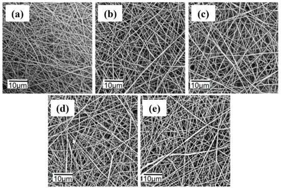 SEM images of fluorescent nanofibers at different distances: (a) 11 cm; (b) 12 cm; (c) 13 cm; (d) 14 cm; (e) 15 cm.