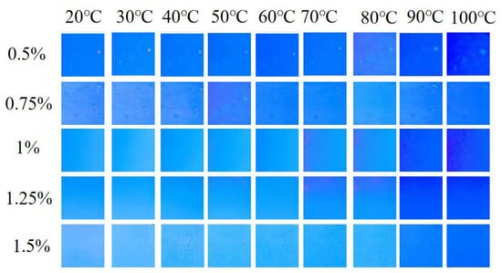Fluorescent nanofiber membranes with TPE contents of 0.5%, 0.75%, 1%, 1.25%, and 1.5% were cut into suitable shapes and adhered flatly to lead blocks. The lead blocks were placed on a TM-926U intelligent temperature-controlled heater, and the temperature was gradually increased from 20 °C to 100 °C. At each temperature point, after the temperature stabilized, photographs were taken under a UV lamp. As shown in Figure 8, from top to bottom, the TPE concentrations were 0.5%, 0.75%, 1%, 1.25%, and 1.5%. From left to right, the fluorescence photographs at different temperatures from 20 °C to 100 °C are displayed. As the temperature increased, the brightness of the fluorescence decreased, with the 1 wt% TPE fluorescent nanofiber membrane showing the most significant change in brightness. Therefore, the 1 wt% TPE fluorescent nanofiber membrane was selected for thermal sensitivity studies.