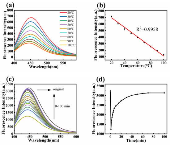 (a) Emission spectra of fiber membrane at different temperatures; (b) The fitting curve of fluorescence intensity with temperature variation; (c) The fluorescence intensity changes after heating the fiber membrane to 100 °C and cooling it; (d) The fluorescence intensity at 460 nm varies over time.