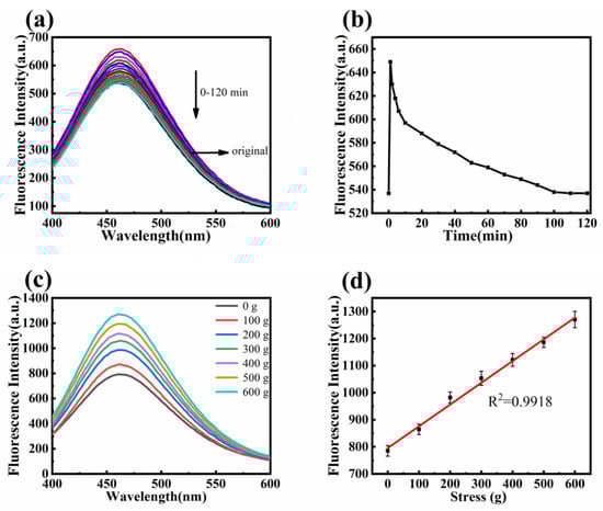(a) Fluorescence recovery emission spectrum after removal of 600 g pressure; (b) Changes in fluorescence intensity at 460 nm over time after removal of 600 g pressure; (c) Emission spectra of membranes under different pressures; (d) Fitting curve of fluorescence intensity of fiber membrane with pressure variation.