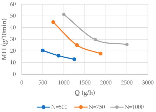 While the Q/N ratio is inversely proportional to the specific mechanical energy (SME) experienced by the polymer during the extrusion process, it has been observed that the MFI value of the material does not remain constant when the Q/N ratio is held fixed. Even with a constant Q/N ratio, the material degradation is higher when both N and Q increase proportionally, as shown in Figure 4. These results suggest that the effect of N is more significant than that of Q in the degradation of the material.