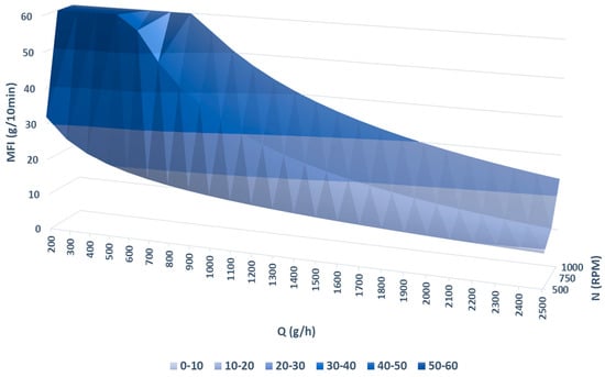 The dependence of MFI on the feed rate for each screw rotation speed was fitted with a power-law-type model using data analysis and graphing software, and the parameters are detailed in Table 7. This model was used to interpolate the values and generate a surface plot that illustrates the evolution of MFI when modifying both the feed rate and screw rotation speed (Figure 3).
