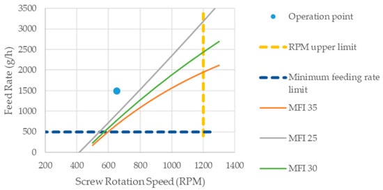 Minimum allowable feed rate for each screw rotation speed based on the established maximum MFI limit.