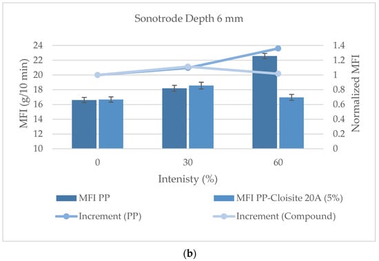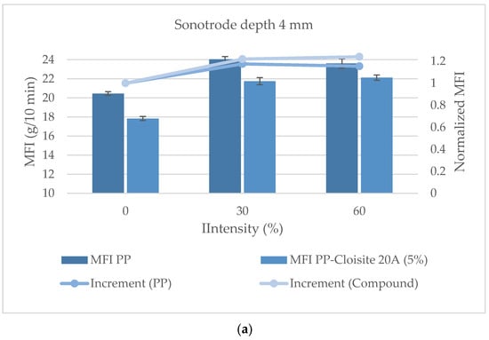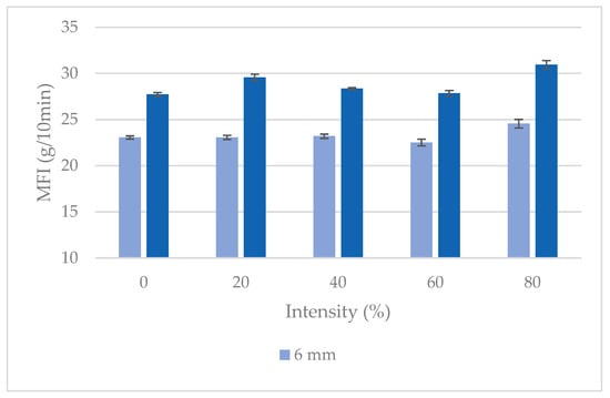 Subjecting the molten polymer to ultrasonic vibrations often leads to its degradation through the formation of macro radicals. It is important to keep the level of degradation below acceptable limits, allowing for a favorable balance between the benefits of ultrasound (improved dispersion of nanoparticles) and its drawbacks (polymer degradation). For this reason, tests were conducted to assess the degree of degradation generated by the ultrasonic treatment on the polymer matrix of the compounds. The material was extruded at the condition established in the previous section, and the ultrasound intensity was varied from 0% to 100% using the US die in both configurations (4 and 6 mm). MFI tests were conducted on the resulting material to assess the degradation in the materials (following the UNE EN ISO 1133-1 standard, with the same conditions as those used in the previous section).