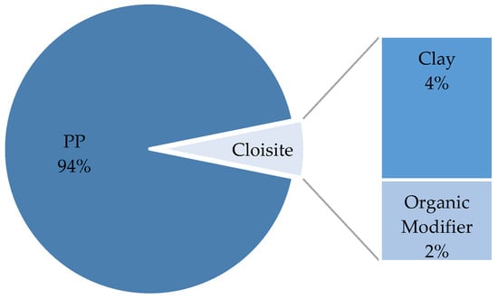 The final composition of the compound was verified through TGA tests and resulted in 96% PP and 6% Cloisite 20A. Additionally, the commercial product Cloisite 20A is 64% clay and 36% organic modifier (these data are provided in the product datasheet, but it was also verified by the TGA of pure Cloisite 20A), so the compounds contained a final clay content of 4%. Figure 7 presents the final composition of the compounds under study.