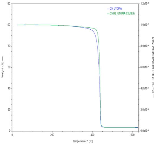 Figure 9 shows the TGA curves for the compounds obtained with (C5 US) and without (C5) ultrasonic treatment during the extrusion compounding process. The compounds C5 US characterized by TGA were the ones treated with 60% US intensity after the good results found in the MFI tests. Evidently, the ultrasonic-treated compound has better thermal stability than the one processed by traditional extrusion compounding. The onset of the mass loss of C5 is 330 °C, while in C5 US, it is shifted to higher temperatures, over 400 °C, and the degradation temperature of C5 is 400 °C, whereas in C5 US, it is 425 °C. This improvement given by the ultrasonic treatment suggests that the nano clays are better dispersed in the polymer matrix in comparison to the non-sonicated compounds.