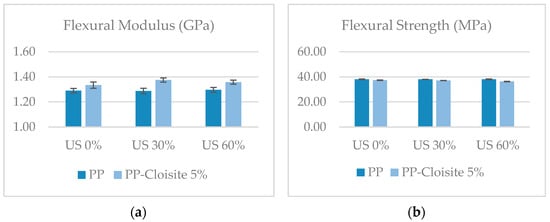 Mechanical properties were characterized by means of flexural tests. Figure 10 shows the flexural strength and stiffness of nano compounds produced with different US conditions. The addition of nanoparticles slightly increased the rigidity (flexural modulus) of the PP (about 3%). When the US is on, the improvement in the modulus is marginally higher than it is when the US is off (6% with the US on). No significant differences could be observed in the flexural modulus among samples processed using 30% and 60% intensity. Regarding the flexural strength, the addition of nano particles slightly decreased this property, and no significant differences could be found in the samples processed with and without US treatment, varying the US intensity. These findings are consistent with other results reported in the literature. Several studies have reported a decrease in the strength of thermoplastic polymers with the addition of nano clays. For example, in a study by Assaedi et al. [], the compressive strength of geopolymer paste initially improved with the addition of 2.0 wt% nano clay, but it decreased when the clay content was increased to 3.0 wt%. Similarly, in the investigation conducted by Fereydoon et al. [], the flexural strength of thermoplastic resin decreased with the incorporation of 7 wt% silica and zirconia nanoparticles. Additionally, the tensile strength and flexural strength of epoxy composites reinforced with curauá fibers and organophilic clay were found to decrease with the addition of 5 wt% nano clay []. On the other hand, the addition of nano clays to thermoplastic polymers has been found to increase the stiffness of the resulting composites in several studies. Khan et al. [] demonstrated that the addition of solvent-exfoliated graphene to polyurethane resulted in composites with increased stiffness. Similarly, Amjad et al. [] reported that the incorporation of nano clay in thermoset- and thermoplastic-based natural fiber composites led to an increase in stiffness. Some other studies have also reported an increase in stiffness with the addition of nano clays to thermoplastic polymers, including cellulose nanocrystal-reinforced starch films [], recycled poly(ethylene terephthalate) composites [], epoxy/thermoplastic/organoclay systems [], and polyamide 12 composites [].