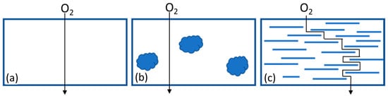 The oxygen barrier properties test is suitable for indirectly assessing the degree of dispersion of nano clays in PP, since this property is less affected by polymer degradation. Also, many industrial applications of nanocomposites, particularly in the packaging industry, rely mainly on the materials’ barrier properties and do not require a significant increase in the mechanical properties of the base materials. Theoretically, if the dispersion of the nano clay layers is effective, it is expected that the material will have lower oxygen permeability due to the increased tortuosity of the diffusive path for gas molecules through the sample thickness, as schematically shown in Figure 12.