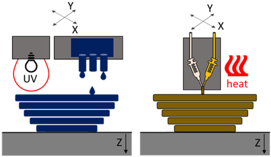The first manufacturing method considered in our study is based on the multi-jet fusion (MJF) process. Here, the curable material is deposited by multiple nozzles and is cured using UV or IR radiation [9,16]. In our case, UV exposure was used. The second manufacturing process is best fitted in the area of material extrusion (ME). It is comparable to the free filament fabrication (FFF) process. Similar processes are also known under the name Liquid Additive Manufacturing (LAM) [19,20]. These processes use Liquid Silicone Rubber (LSR), which is selectively deposited through a nozzle or syringe on the printing bed. Depending on the crosslinking mechanism, the silicone is crosslinked due to mixing with a second component (Room Temperature Vulcanization RTV-2) or exposure to heat or UV [14,15,21]. In our case, the process was heat-supported. In Figure 1, the working principles of the two processes are shown.