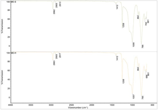 For the spectra of ME-S and ME-H, it can be said that they are also identical and correspond to pure polydimethylsiloxane (PDMS) with a correlation factor of 0.995 [29,30]. The peaks around 2960 cm−1 and 2815 cm−1 are characteristic of the -CH3 symmetric and asymmetric stretching, and 1412 cm−1 can be attributed to -C-H bending vibrations in the methyl group. The peaks at 1258 cm−1 and 660–865 cm−1 are attributed to -Si-CH3 stretching and bending vibration, respectively.