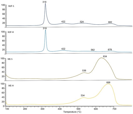 EGA-MS thermogram of MJF-S, MJF-H, ME-S, and ME-H samples.