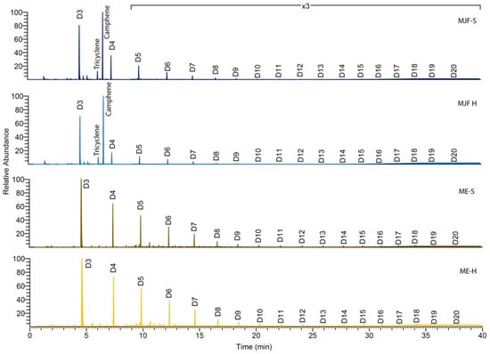 Py-GC/MS of all samples (Figure 7) results in a number of cyclic dimethylsiloxane pyrolysates (Dn where the n refers to the number of dimethylsiloxane units) typical of PDMS [33] which result from chain backbiting reactions [34]. Lewicki et al. [34] demonstrate that the distance between crosslinks is reflected in the pyrogram.