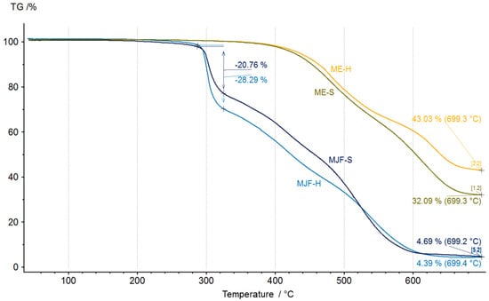 Differences between the materials are recognizable. The MJF materials show higher mass changes starting around 290 °C, which can be attributed to the release of camphene from the linking chains in the sample (equivalent to the event with a max at 318 °C in EGA-MS). The inorganic residue is, with ca. 5%, quite low for the MJF materials, so it is not likely that they contain mineral ingredients. Therefore, it is probable that the higher hardness is due to higher crosslinking. This is supported by the higher mass change measured at around 300 °C (28.29% vs. 20.76%) interpreted as related to the isobornyl acrylic fragments.