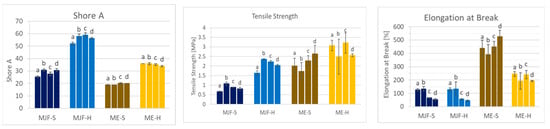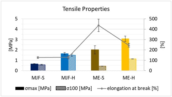 In terms of mechanical properties, it can be observed that the ME materials have higher tensile stress and elongation at break in direct comparison to the MJF material (see Figure 10). This can be explained by the presence of fillers, as they are often used exactly for the improvement in mechanical properties [35,36,37,38]. The tensile strength and stress at 100% elongation (often called modulus 100) are higher for the harder materials relative to the softer ones from both manufacturing routes. The elongation at break is identical for the MJF materials. Regarding the extruded materials (ME), it is lower for the harder material (ME-H). This can be due to the higher filler amount used to adjust the hardness. For the ultimate properties, a higher deviation is observed for the ME materials. This can also be due to the fillers and their not fully homogeneous distribution within the polymer. Interestingly, they are less stiff, which is seen in the lower stress levels at 100% elongation. The reason for that may be that the MJF materials are more thermoplastic due to the contained polar acrylic and hydroxylic groups.