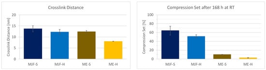 Figure 11 shows the crosslink distance results obtained by freezing point depression and the compression set for the investigated materials. The hardness values can be correlated with the crosslink distance. For the two hard materials, as expected, the distance between the crosslinks is lower than for the soft materials, which means higher crosslink density. It is observed that the variation is lower for the ME materials, which speaks for more evenly distributed crosslinking. It must be mentioned that the presence of fillers in the ME materials shifts the values for the crosslink distance to lower values that are also dependent on the filler content. This is due to the fact that filler particles are between the macromolecular chains and reduce the solvent available volume. The compression set for the MJF materials is relatively high at approx. 50 and 65%, which indicates a lower elasticity of the material compared to the ME materials. These are in the range of approx. 10 and 4%, which is more common for silicones [46,47]. The higher compression set for the MFJ materials can be explained by the presence of the polar groups (acrylic and hydroxylic), resulting in a more thermoplastic behavior.