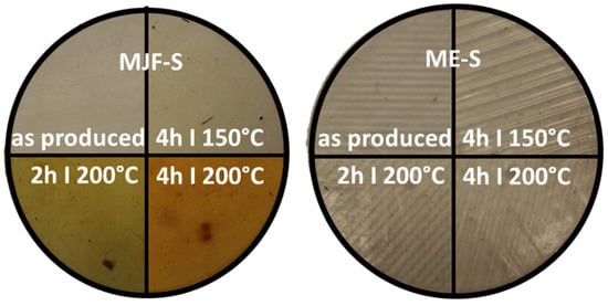 After the annealing study, more pronounced color changes for the MJF materials were observed. Figure 12 shows the appearance of the softer materials MJF-S and ME-S. The results were similar for the harder materials MJF-H and ME-H.