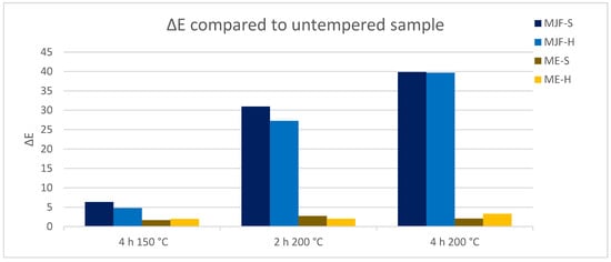 Color changes delta E due to tempering, measured with the L*a*b system.