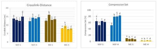 Increasing the temperature to 200 °C (comparison ‘b’ to ‘d’ in Figure 14 and Figure 15) leads to a small decrease in the mechanical properties accompanied by increasing crosslink distance and compression set, meaning lower crosslink density resp. reversion for the MJF materials. The ME materials behave differently. While the hardness and the ultimate properties increase and the crosslink distance and the compression set decrease for the softer material, indicating additional crosslinking, the changes are very small for the harder material.