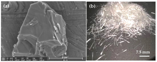 Glass fibers (GFs) were used in amounts of 1 and 3 wt%. These short fibers, each 6 mm long and with a diameter of 2 ± 0.5 mm, have a density of 2.38 g/cm3 (Figure 1b). The mesh density is 1.69 g/cm3, and the mesh size is 3.50 mm. The GF and mesh densities were calculated by Archimedes’ principle, and both were supplied by Feroca S.A. (Madrid, Spain).