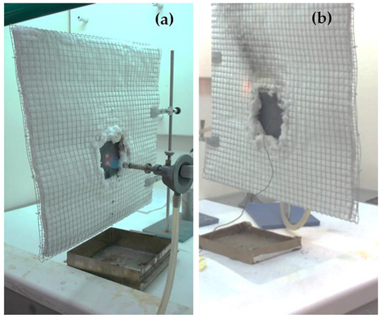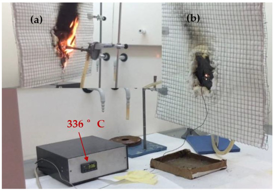 Three sheets of 100 mm × 100 mm with a thickness of 3.5 mm were fabricated for each composite to conduct fire tests. These tests involved exposing the samples to a flame at 900 °C (measured with a thermocouple) from a Bunsen burner fueled by butane gas. The reducing zone of the flame was in contact with the material during the test (Figure 2a). The temperature on the side opposite to the flame was measured with a thermocouple (Figure 2b). The test was continued until the flame passed to the other side of the sample, and each composition was tested three times.