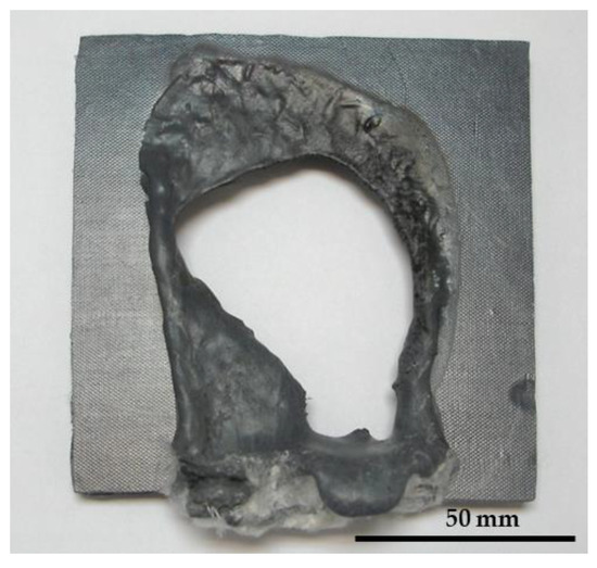 The use of a polyester matrix prevented melting because it is a charring thermoset polymer (Figure 4a), although the fire tests were still relatively short (Table 3). However, when the short fibers were replaced with glass mesh (Figure 5) in the same proportions, the temperature measured by the thermocouple reached 336 °C (Figure 4b) before the flame passed, and the time increased to 430 s (Table 3). At around 200 s, the composite with the UPE + 50SiC + mesh did not show any visible cracks (Figure 4b) and retained its shape until the end of the test; this was due to the mesh (Figure 4c).