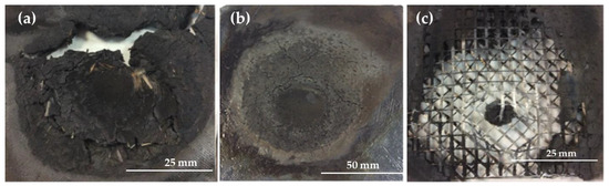 UPE composites after the fire test (a) UPE + 50SiC + 3GF, (b) UPE + 50SiC + mesh at 200 s and (c) UPE + 50SiC + mesh at the end of test.