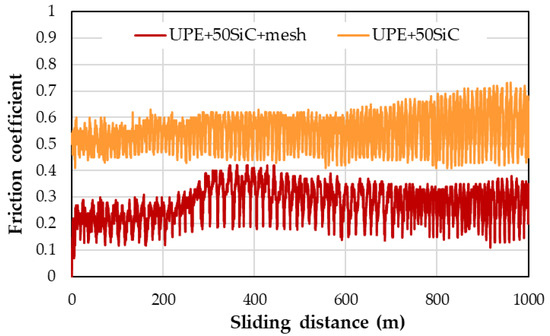Examples of friction coefficient curves for UPE + 50SiC and UPE + 50SiC + mesh.