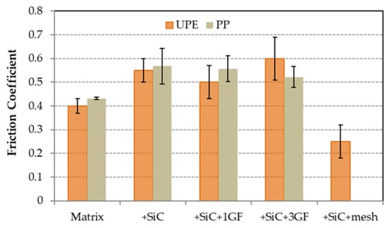 The friction coefficient (FC) for the studied matrices and composites is shown, with each value representing the average of three samples (Figure 7). The inclusion of SiC, due to its abrasive nature, increased the FC for both matrices. While short glass fibers did not have a significant impact on the FC, their random distribution appears to contribute to a slight increase. The addition of mesh notably reduced the FC in the UPE composite by approximately 40%, making it the composite with the lowest FC observed in this study.