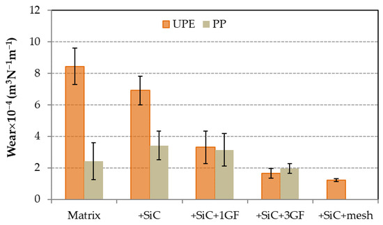 The wear of the matrices was quite different, as it depended on their rigidity and relative density. The wear of PP was 71% less than that of UPE (Figure 8), indicating different wear mechanisms for each matrix. The wear of the UPE composites progressively decreased with the addition of SiC and GF, reaching the lowest value (−85%) for UPE + 50SiC + mesh. Conversely, the wear of PP composites increased by 38% with the addition of SiC, likely due to increased rigidity. However, for the composite with 3GF, the wear decreased slightly.