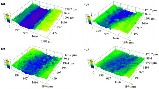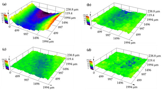 Figure 9 depicts the wear tracks in 3D images by OM. The PP track (Figure 9a) appeared clearer than the composite tracks, with a higher depth for PP + SiC (Figure 9b). However, the composite tracks showed more accumulation at the edges when GF was added (Figure 9c,d). The track width values for PP, PP + SiC, PP + SiC + 1GF, and PP + SiC + 3GF were 1308 ± 18 μm, 2157 ± 134 μm, 1816 ± 83 μm, and 1286 ± 103 μm, respectively. The depth also changed, although these changes were smaller, measuring around 80 ± 15 μm for PP and PP + SiC and around 75 ± 19 μm for PP + SiC + 1GF and PP + SiC + 3GF.