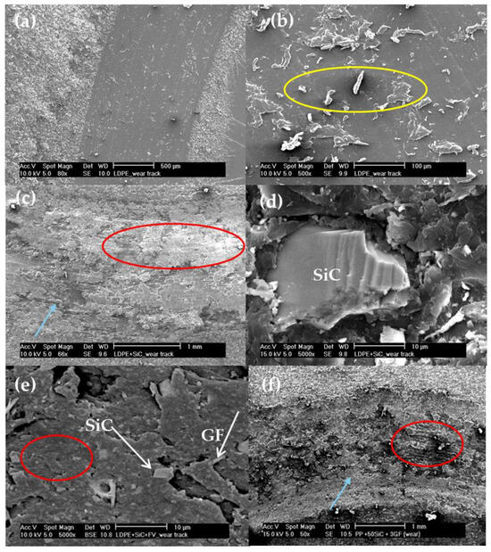 At low magnification, the wear track of PP appeared to be clean and quite uniform (Figure 11a). When examined at higher magnification, some debris powder was visible (Figure 11b), but there were no signs of accumulation or agglomerates. However, with the addition of SiC, accumulation or agglomerates formed on the track (red cicle), along with visible abrasion lines (blue arrow) (Figure 11c). Within these agglomerates, SiC particles could be found, which exhibited abrasive or fatigue lines on their surfaces (Figure 11d). GF particles were also visible within the accumulated powder on the track (Figure 11e,f), along with areas showing abrasion lines (Figure 11f).